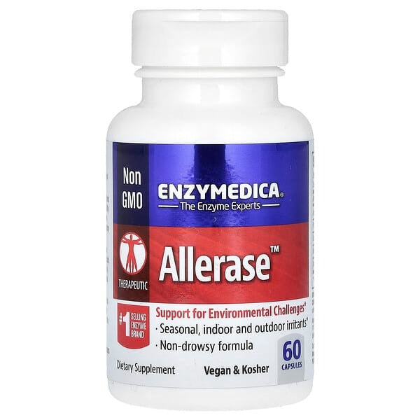 Enzymedica, Allerase, 60 Capsules Non-GMO The Enzymes Experts Therapeutic #1 Selling Enzyme Brand Support for Environmental Challenges Seasonal, Indoor and Outdoor Irritants Non-Drowsy Formula Dietary Supplement Vegan Kosher Parve No Fillers Added The body constantly encounters environmental and seasonal challenges that can cause a variety of discomforts. Allerase™ contains an...