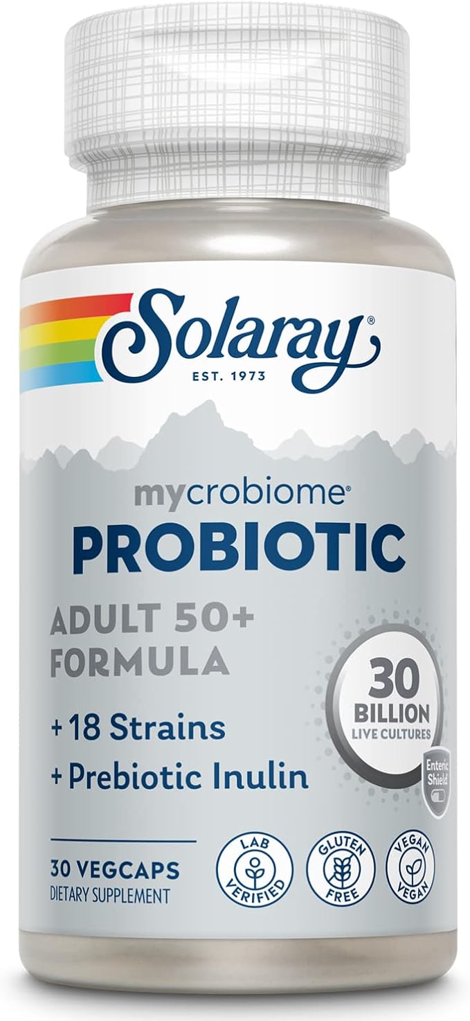 Ingredients: Mycrobiome Adult 50+ Blend [(Supplying 30 Billion CFU** Living Organisms) B. lactis, B. infantis, B. longum, L. plantarum, B. bifidum, B. breve, L. rhamnosus, L. acidophilus, L. paracasei, L. lactis, L. casei, L. bulgaricus, L. delbrueckii, E. faecium, L. brevis, L salivarius, Lc. Lactis and Lc. cremoris]; Other Ingredients: Inulin, Vegetable Cellulose Capsule, Rice Bran Extract and Silica. ** Minimum potency at time of manufacture. Live organisms per 1 capsule serving.